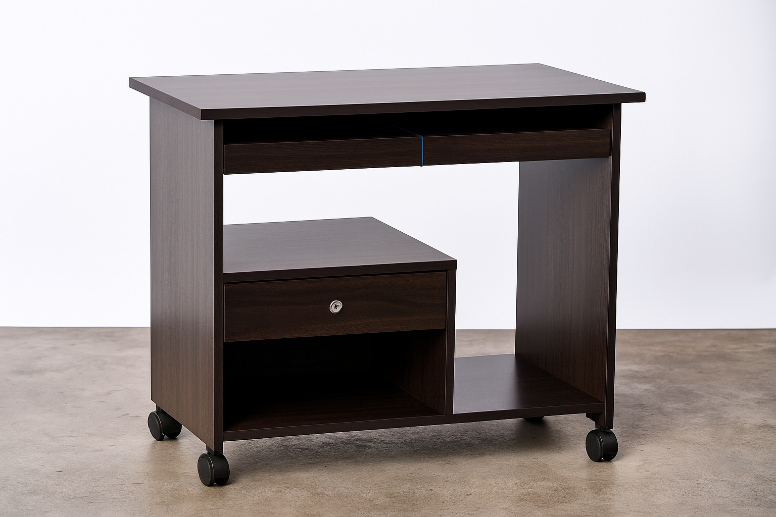 This mobile compact computer desk (Model no-137) is an ultra-slim, efficient workstation designed to provide full computing functionality within a minimal footprint. It features a rich, dark espresso wood-grain finish and a multi-tiered layout that prioritizes organization and ease of movement, making it ideal for small home offices or dormitories.