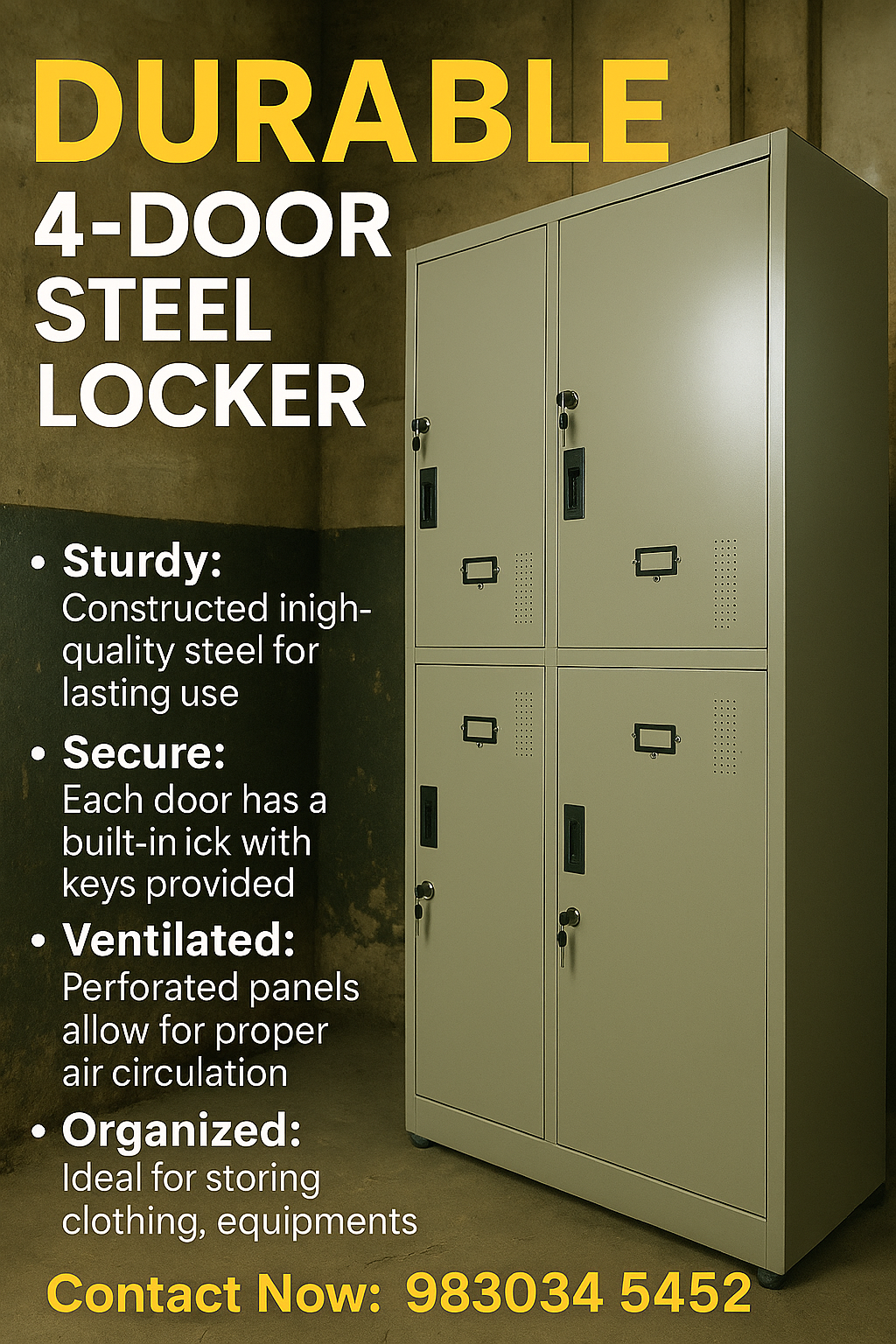 This durable 4-door steel locker is a secure and practical storage solution designed for workplaces, institutions, and industrial environments. Manufactured from high-quality steel, it offers excellent strength and long-lasting performance. Each compartment is fitted with an individual locking system to ensure safety and privacy, while the ventilated door panels promote proper air circulation and prevent odor buildup. With its compact yet organized design, this locker is ideal for storing personal belongings, uniforms, tools, and equipment in an efficient and orderly manner.