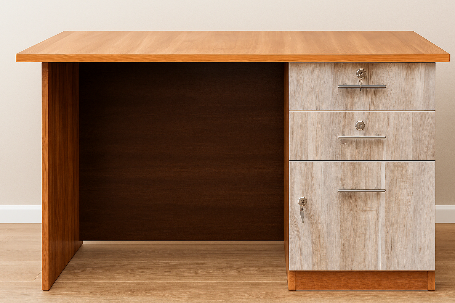 • Single-Pedestal Storage Configuration: The desk is designed with a storage tower on the right side, consisting of two shallow top drawers and one deeper bottom drawer for filing or larger supplies.