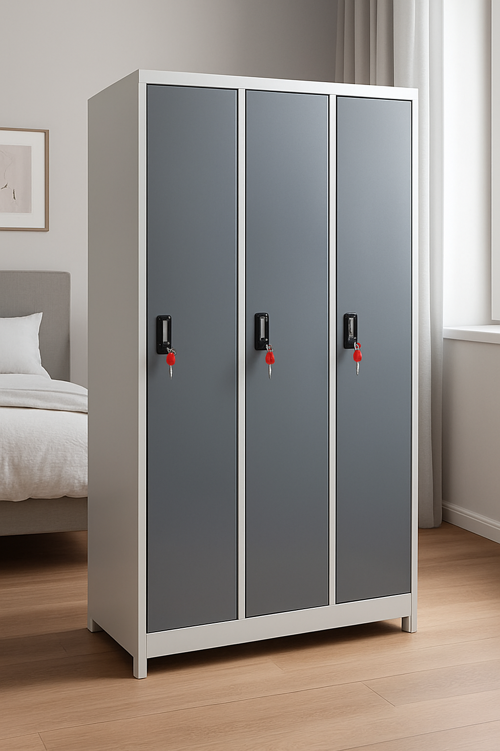 A compact triple-door steel almirah with a modern dual-tone finish, designed for secure and organized storage. Featuring individual locking doors and a sturdy frame, it is ideal for bedrooms, hostels, offices, or institutional use.