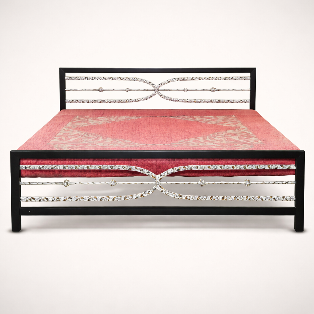 This metal bed features a sturdy black powder-coated frame accented with elegant silver ornamental detailing, giving it a refined yet contemporary appeal. Designed for durability and visual impact, the bed combines strong construction with decorative craftsmanship, making it suitable for modern as well as classic bedroom interiors. The clean lines, balanced proportions, and premium finish make it ideal for everyday use while enhancing the overall aesthetic of the space.