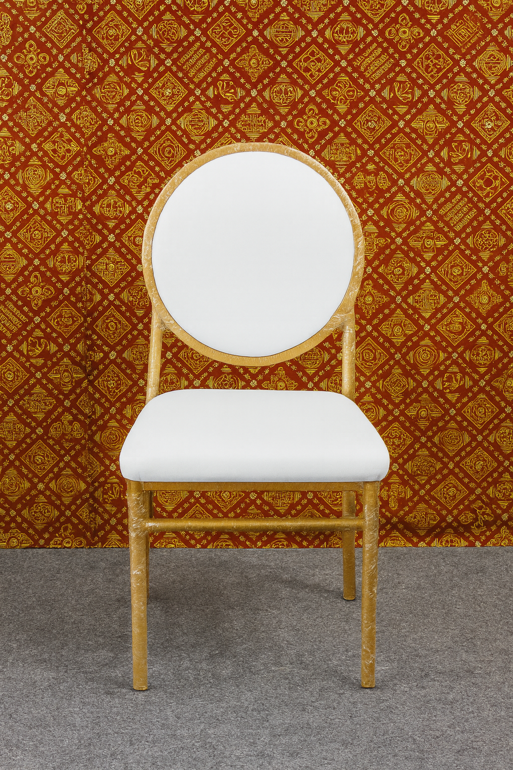 A banquet-style chair with a round padded backrest and cushioned seat. It has a gold-finished metal frame with four straight legs and a support bar, placed against a red patterned background.