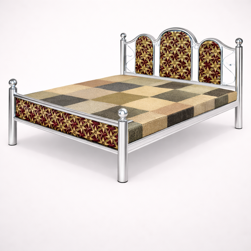 This stainless steel bed features a sturdy, corrosion-resistant frame with an elegant ornamental headboard that adds a refined look to any bedroom. Designed for long-term durability and daily comfort, it offers excellent load-bearing strength while maintaining a sleek, low-maintenance finish. The balanced construction ensures stability, and the clean lines make it suitable for both modern and traditional interiors.