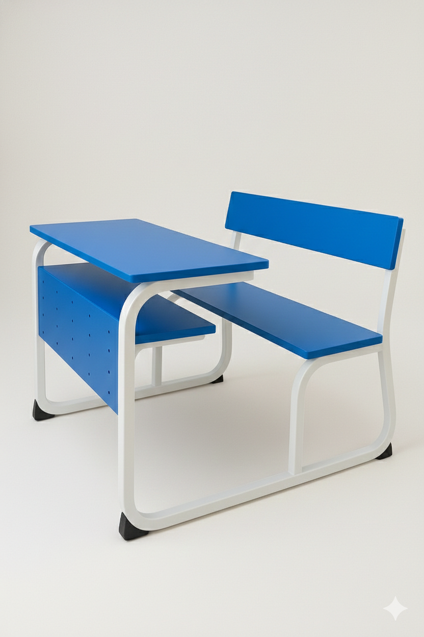 This Dual Student Desk and Bench is a highly functional, all-in-one educational furniture solution designed to optimize space in modern classrooms. Built with a focus on durability and ergonomics, it features a sturdy white-coated metal frame that supports a vibrant blue laminate desktop and integrated seating. Its sleek, “S” curve frame design eliminates sharp corners and clutter, making it an excellent choice for high-traffic learning environments where both comfort and longevity are essential.