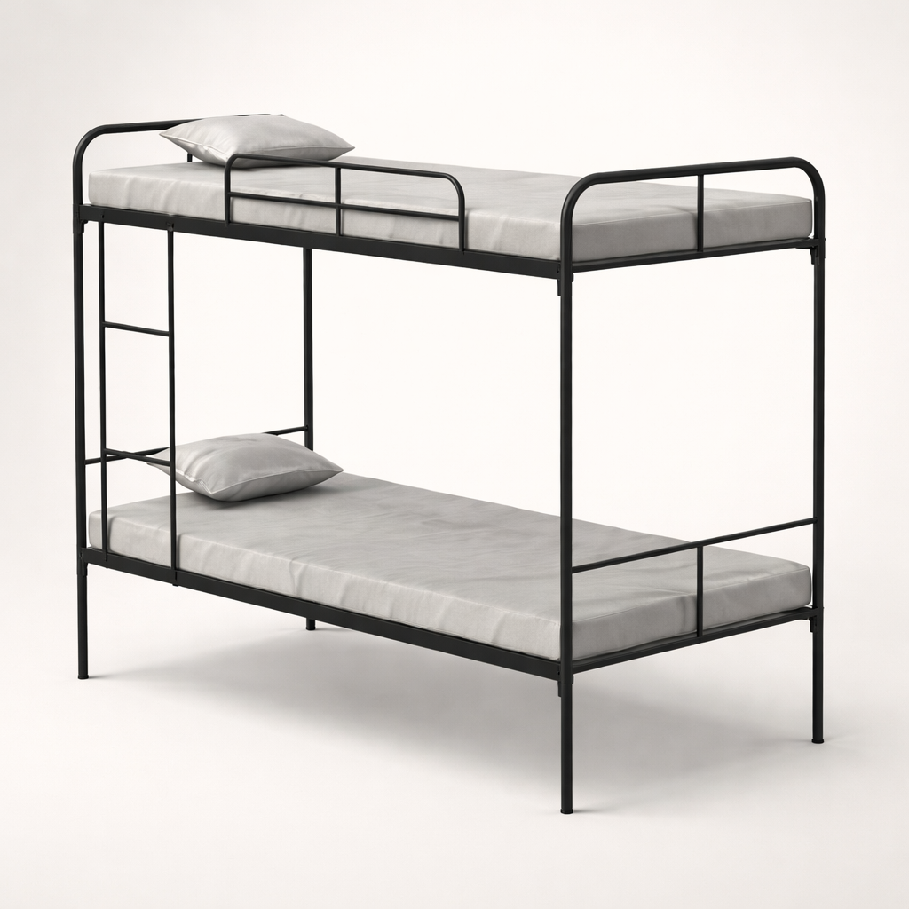 This metal bunk bed is designed for durability, safety, and everyday comfort, making it ideal for hostels, schools, dormitories, and compact living spaces. Built with a strong powder-coated steel frame, it offers excellent load-bearing capacity and long-term reliability. The upper bunk features sturdy guard rails for enhanced safety, while the integrated ladder allows easy and secure access. Its clean, minimal design fits well in both residential and commercial environments, and the space-saving structure helps maximize room efficiency.