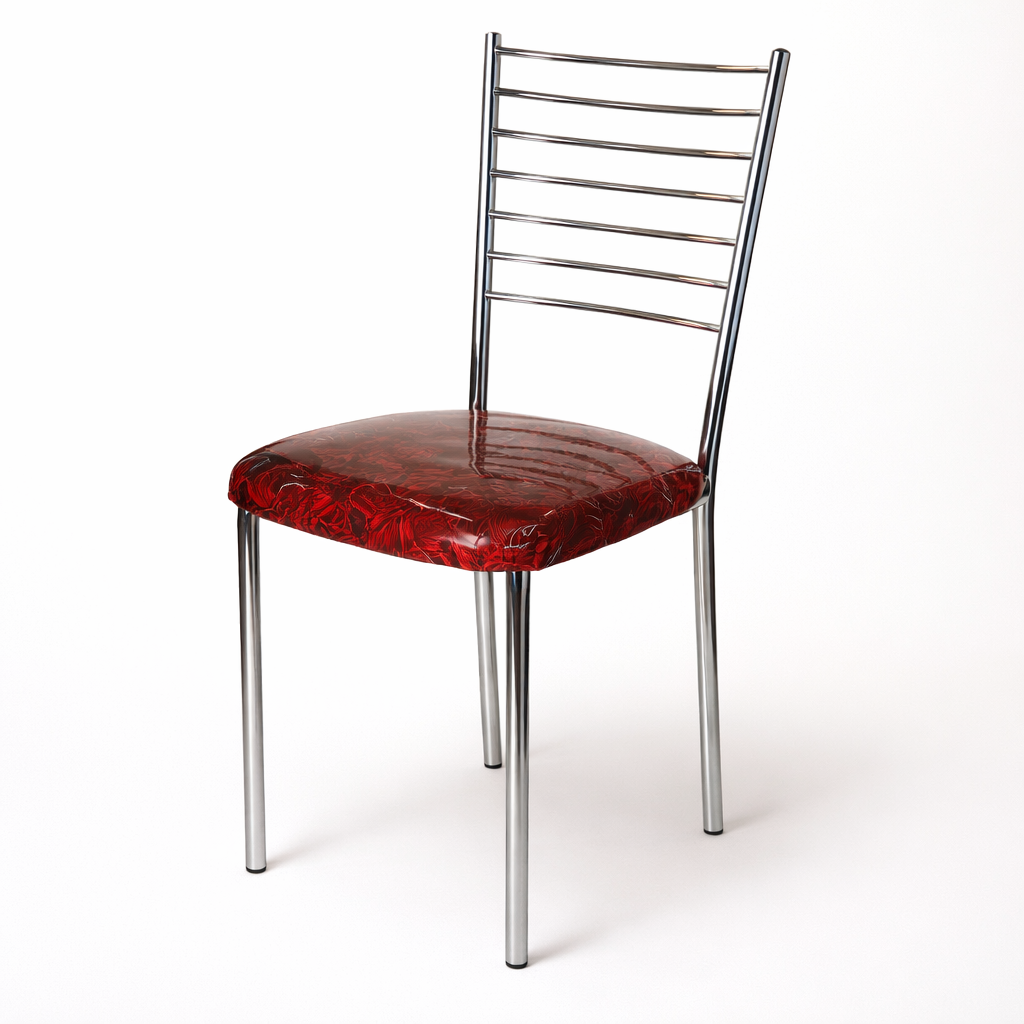 This contemporary chrome dining chair completes the high-gloss aesthetic of your collection, merging the structural ladder-back design with the vibrant, marbled upholstery seen in the previous seating options. It features a high, upright backrest with seven horizontal chrome slats, providing a clean, architectural look that emphasizes verticality and light. The square seat cushion is finished in a brilliant, reflective red and black marbled material, offering a bold and sophisticated pop of color that ties together the various metallic frames in your set.
