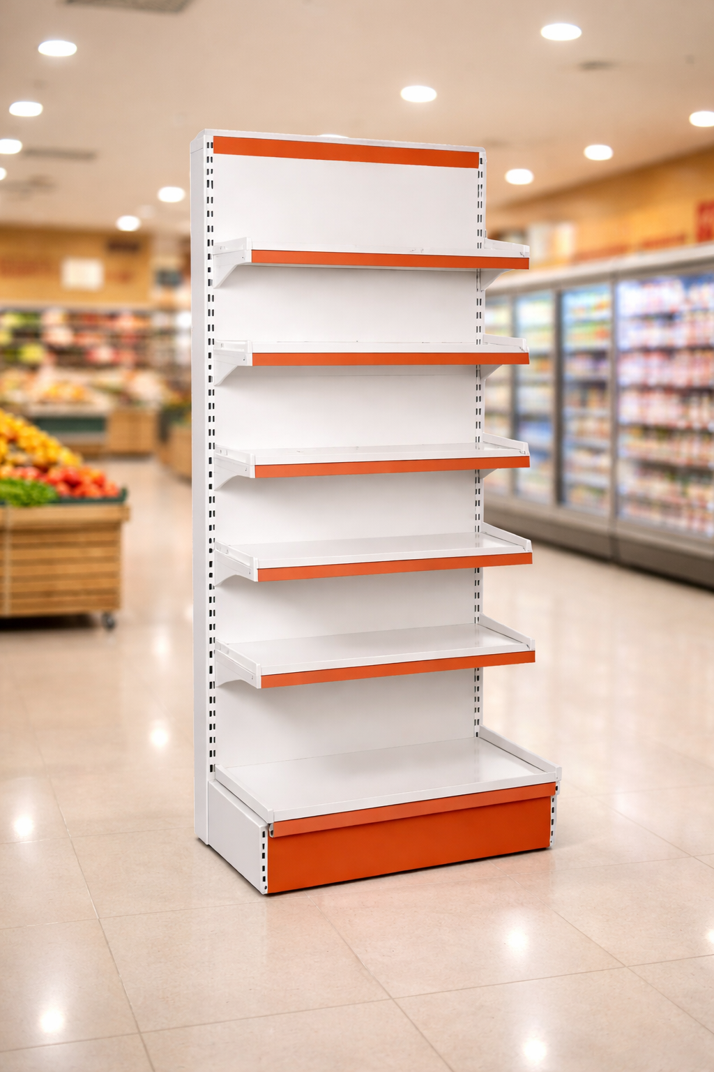 Integrated Branding Space: The top panel and shelf edges (data strips) are colored orange, offering consistent branding and clear areas for price labeling.