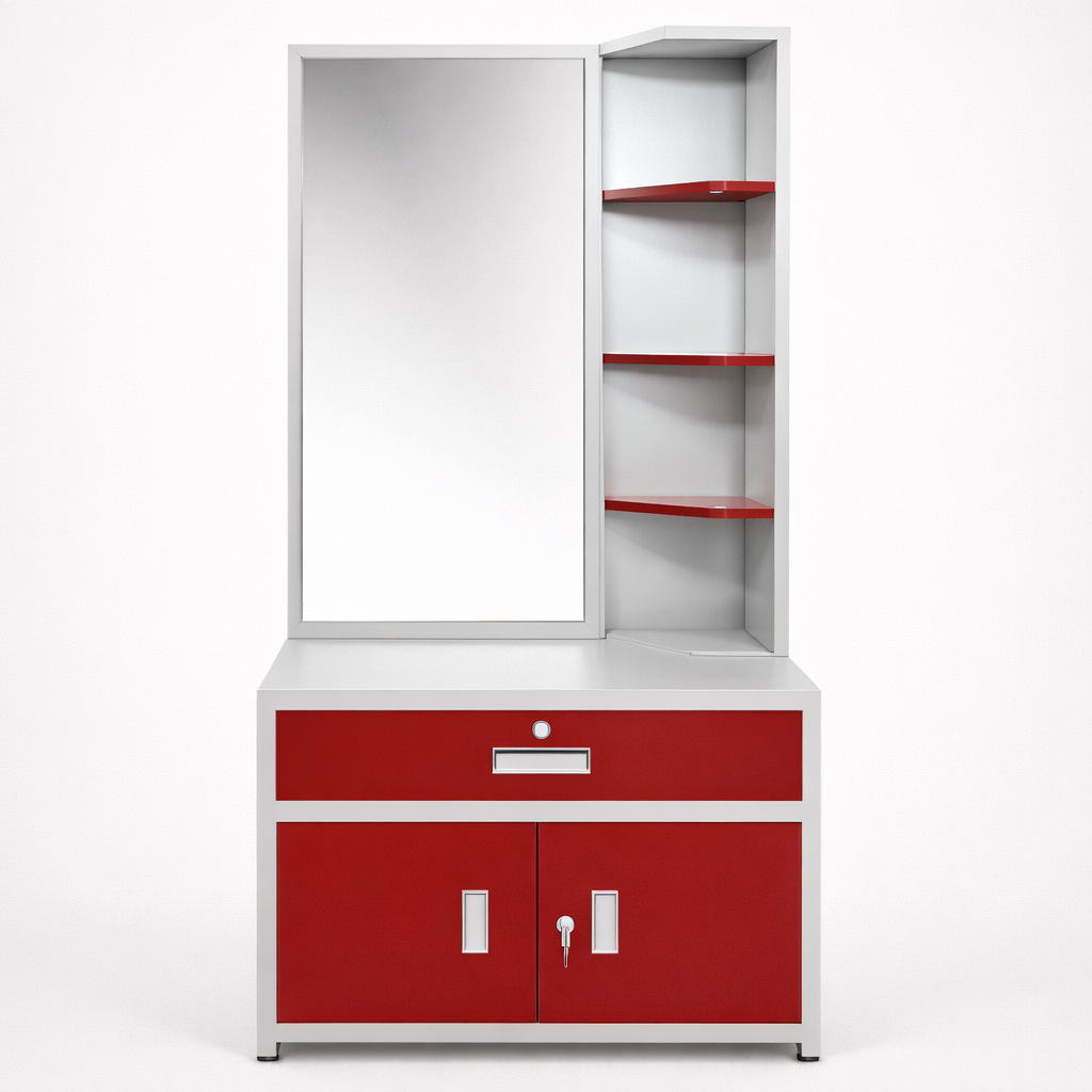 High-Contrast Red Storage Base: The lower section consists of a solid vanity chest with a single top drawer and a double-door lower cabinet, all finished in a vibrant red with polished metallic trim.