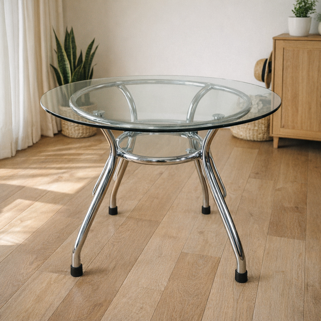 Structural Materials: Features a clear, circular tempered glass top supported by a high-luster tubular chrome-plated frame.