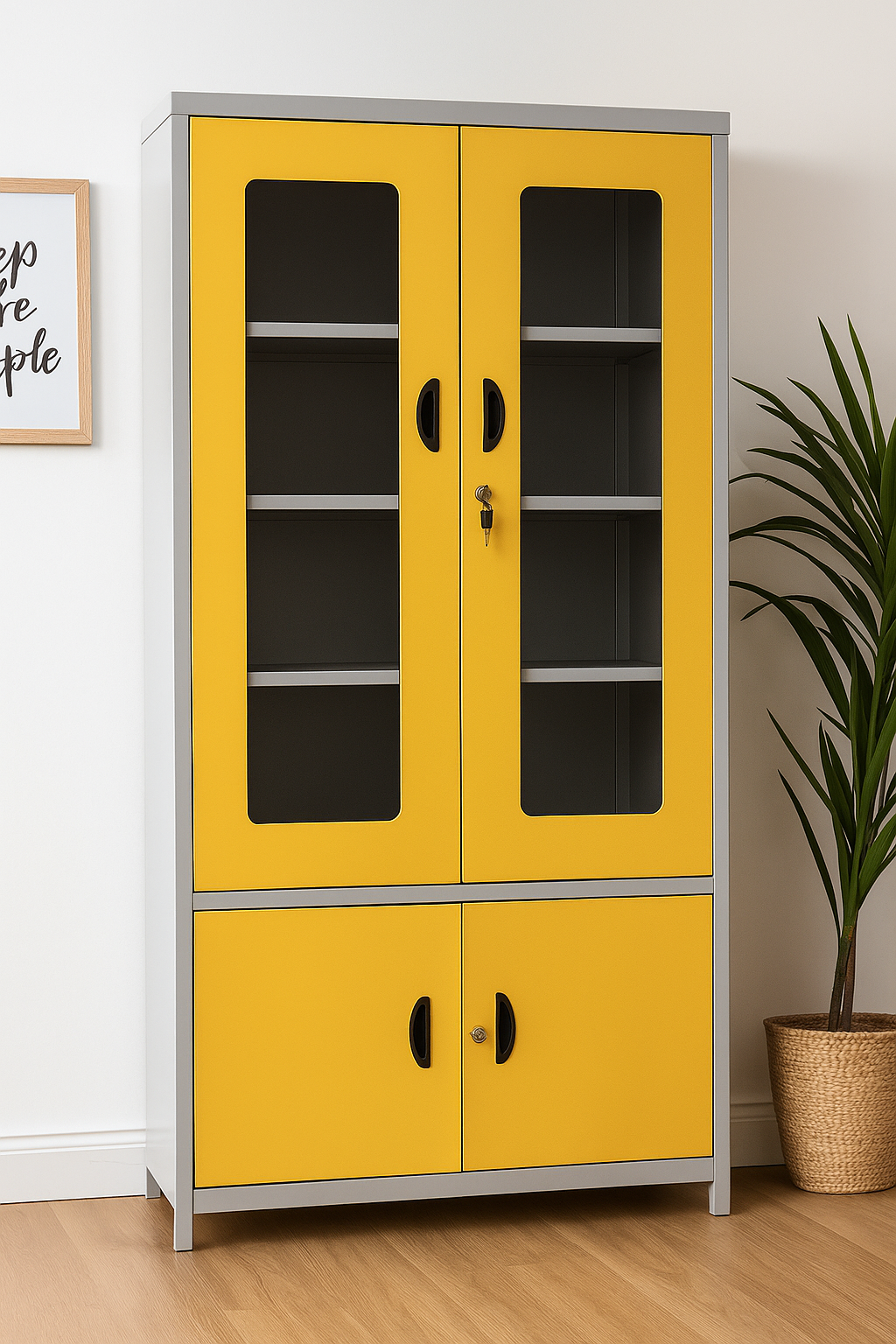 This professional steel storage cabinet is a vibrant and highly secure organization solution, perfect for offices, schools, or modern industrial workspaces. Featuring a bold yellow and grey finish, it provides a contemporary touch while offering extensive storage capacity across its multi-tiered shelving system. The combination of glass display panels and solid base compartments ensures that essential items are both visible for quick access and securely stored out of sight when needed.