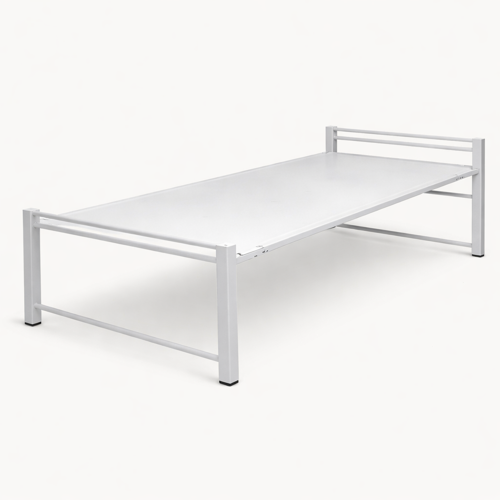 This product is a minimalist single metal hostel bed, engineered for durability, functionality, and institutional use. The structure features a powder-coated white steel frame with a flat solid sleeping platform, supported by four square-section legs and reinforced with horizontal stabilizing bars at both ends and along the base for additional strength.