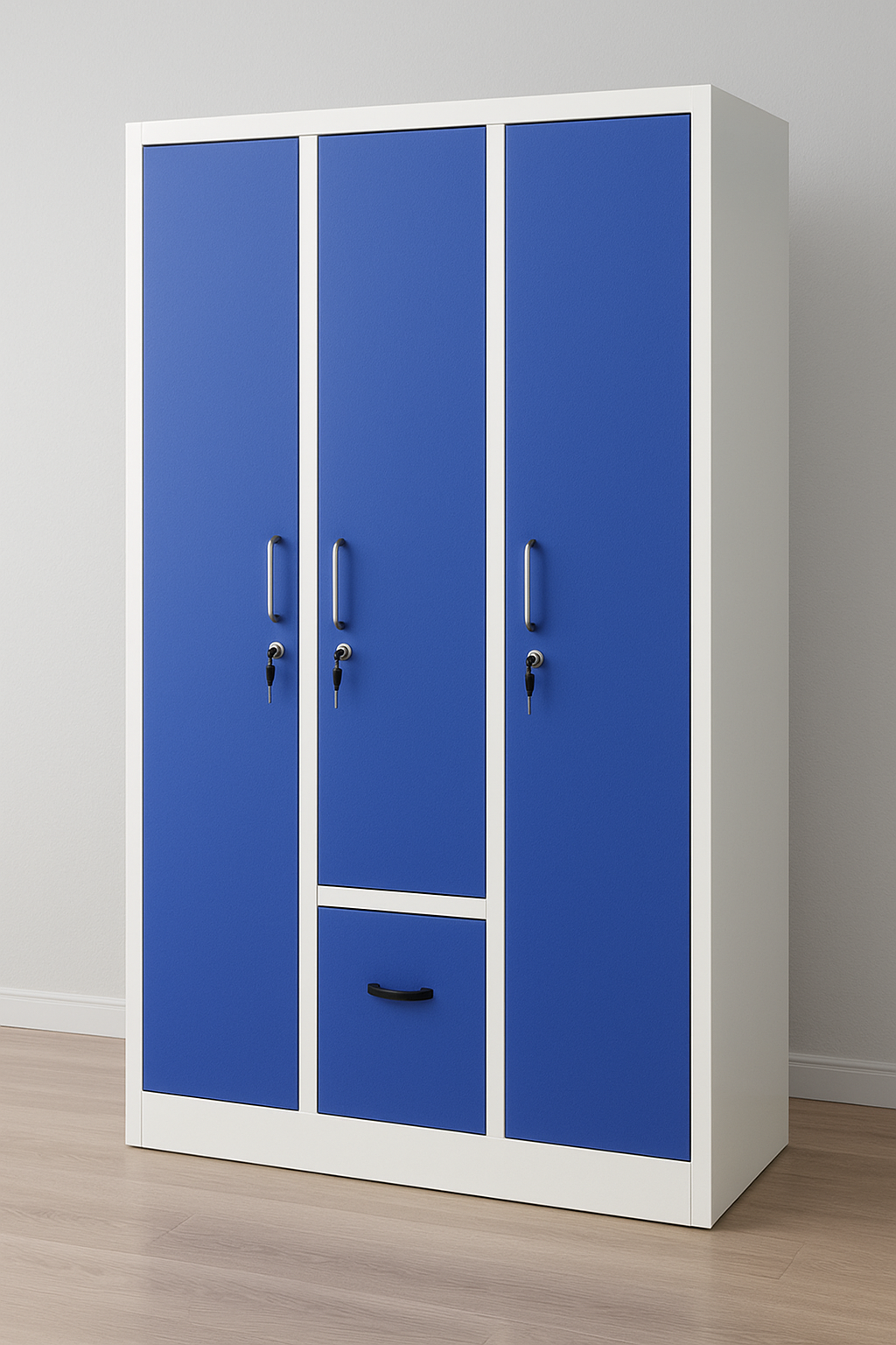 A modern triple-door steel almirah with a stylish dual-tone finish, combining durability with contemporary design. Equipped with individual locking doors and an additional lower drawer, it provides organized and secure storage for homes, offices, and institutions.