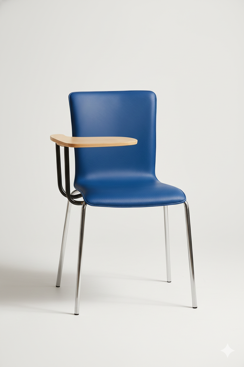 This Premium Tablet Arm Chair is an elegant, space-saving seating solution perfect for lecture halls, training seminars, and compact study areas. Combining a sophisticated aesthetic with practical utility, it features a contoured, high-back seat upholstered in deep blue textured fabric for long-lasting comfort. The integrated wooden tablet arm provides a stable surface for note-taking or tablet use, while the sleek chrome legs offer a modern, lightweight silhouette that fits seamlessly into professional and academic environments.
